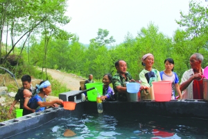 8月14日,花垣县排料乡的村民们从临时蓄水池里喜舀泉水。省委组织部驻该乡金龙村扶贫工作队未雨绸缪,早在5月底就组织村民在一个深山溶洞里找到了水源。尔后,省委组织部积极联系资金94万元,组织队伍打隧洞,架水管。近日,一股每天流量达140方的泉水终于从3000米外的溶洞引到了乡里的临时蓄水池,解决了全乡7个村6000多人的人饮困难。 张耀成 摄