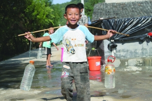 8月13日,花垣县吉卫镇腊乙村的一名小孩子高兴地挑水回家。该村历经半个月,终于挖出了一口30多米深的水井。当天,成功从水井中抽出水。这口水井解决了全村1800多人饮水难题。