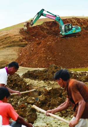 8月14日,在与三都水库临近的宝田水库,当地政府组织村民围堰抽水,将最后的一点库容抽出抗旱。 随着高温少雨天气持续,干旱在三湘大地飞速蔓延。记者近日在湖南旱情最为严重的邵东县走访调研时了解到,全县一半以上人口发生饮水困难,县城30万人口限时供水,全县9座中型水库中仅剩3座还可输水2天,117座小型水库中仅5座还有抗旱能力,多个作为水源地的水库达到死水位以下,甚至完全干涸见底,远看如荒漠戈壁一般。 记者13日从湖南省防汛抗旱指挥部了解到,随着旱情持续,全省近9成乡镇、自然村受旱,85%以上的国土面积不同程度受旱,导致超过306万人出现饮水困难。干旱还导致2010万亩农作物受旱,受旱农田占耕地面积总数35%,其中重旱912万亩、干枯432万亩。 新华社记者 白 禹 摄 |