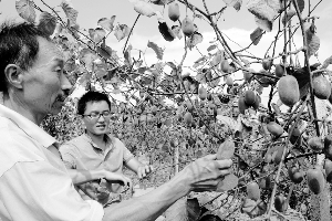 8月15日,永顺县芙蓉镇发树村村民李瑞云,在猕猴桃地里查看被晒枯了的猕猴桃,盘算着如何减少损失。在烈日高温“烧烤”下,猕猴桃果脱水严重,该县5万亩猕猴桃严重受灾,产量将减少50%以上。目前,果农们正设法减少损失。 刘文化 摄