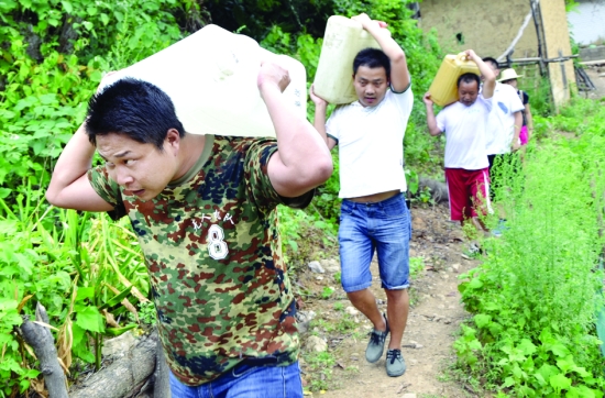 唐光勇带领村干部扛着25公斤的水壶,疾走在通往黄昌青家的小路上。 周玮玮 摄