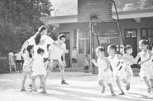7月上旬以来,湖南第一师范学院学子,在该校支教社发起的“守望支教”———“湘西木芽支教行”活动中,来到保靖县葫芦镇木芽村小学,与该村的留守儿童一起度过了一个幸福、难忘的暑假。图为支教学生与孩子们玩游戏。