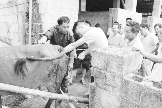 为了加快湘西黄牛产业发展的步伐,为湘西黄牛产业发展提供技术保障,花垣县畜牧水产局于8月16-19日举办了湘西黄牛品改技术培训班,聘请州县级专家作现场指导和授课,培养一批村级品改技术员。图为花垣县董马库乡畜牧站站长石远文(左一)在为学员们亲自示范和指导黄牛的冷配技术。 黄若琪 摄
