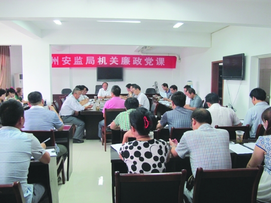 近年来,州安监局强化干部队伍廉政建设,促进安全监管,取得了显著成绩。2011年至2012年,全州未发生一起重大安全生产事故。图为8月31日,该局全体干部职工上廉政党课。 黄立好 摄