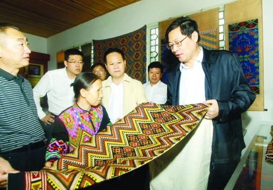 9月2日至4日,省委副书记、省长杜家毫在湘西自治州调研。9月3日,省委副书记、省长杜家毫(前排右一)在州委书记叶红专(前排右二)等州级领导的陪同下来到龙山县苗儿滩镇捞车河村了解土家族织锦技艺。 本报记者 彭 伟 摄
