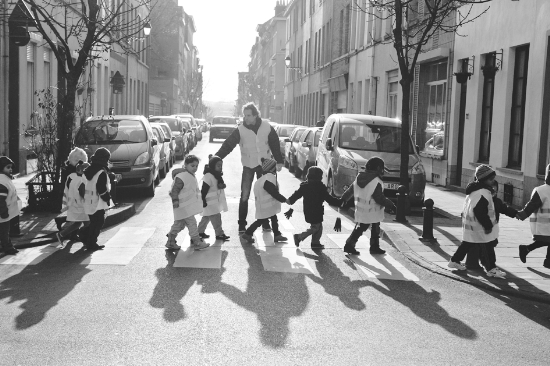 2013年2月21日,在比利时首都布鲁塞尔,一家幼儿园的老师保护小朋友过马路。 新华社记者 叶平凡 摄