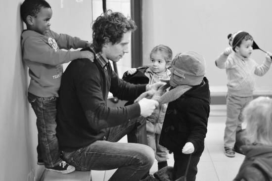 这是2013年2月21日,在比利时首都布鲁塞尔一家幼儿园,小朋友出门活动前老师为其穿好外套,身后的小男孩在为老师按摩肩膀。 新华社记者 叶平凡 摄