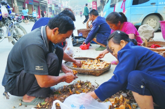9月16日,永顺县吊井乡乡场上很多村民在卖枞菌,引来场上居民争相购买。近年来,退耕还林见成效,生态环境越来越好,为枞菌大量繁殖提供了有利条件。进山采枞菌已成农民的一项可观收入。 吴 华 摄