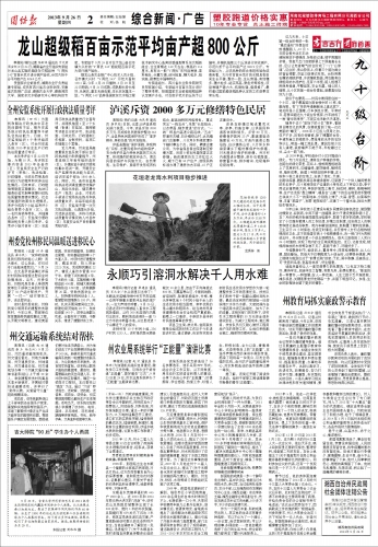 本报讯(特约记者 覃遵奎 通讯员 肖大全)“水从洞里引出来了!”永顺县灵溪镇泽树村村支书郑启炼一边用手捧着水管里冲出来的地下水,一边大声地欢呼着。9月25日,记者在该村竹根坡组人畜饮水工程现场看到,从约300米溶洞内巧集引出的水,顺利地流进洞外一座75立方米的中转蓄水池,从这里流进7个山寨近千人的家中。 泽树村有10个村民小组,256户村民1233人。该村虽然距永顺县城仅10余公里,但由于平均海拔达800米,又属高寒山区,卡斯特地貌、岩溶地形,除谢家坡组外,竹根、棒头坪等其他9个村民小组千余人的生活饮用水相当困难,常年饮用的是山塘水和稻田水,给当地村民身体健康和生命安全构成严重威胁。能喝上一口清凉、干净的水是泽树村民祖祖辈辈的梦想。 该县卫生局、统计局、信用联社等单位组成的扶贫工作队于今年进驻该村后,通过调研,决定将实现泽树村民生活饮用水梦想作为新一轮建整扶贫工作的首要任务。扶贫队员们和村干部一起翻山越岭寻找水源;最后决定利用竹根坡组一处溶洞地下水作为水源。大家把洞内各个细流用水泥石块堵住,加大了水的流量。在相关部门的支持下,该村引水工程所需的30万元资金逐步落实到位。为减少工程成本,施工期间,扶贫队员们又耐心做好工程用地户主的思想工作,让他们积极配合施工,确保项目顺利实施。 |