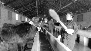10月20日,保靖县丰泰养殖专业合作社员工,在扁槽牧场鲁西黄牛养殖栏舍打扫卫生。今年3月,在花垣开矿的彭书云返乡创业,他充分利用本地丰富的草场资源,投资86万元从山东引进鲁西黄牛70头,修建标准化栏舍、青贮料仓库等设施7200平方米,当起了牛老板。