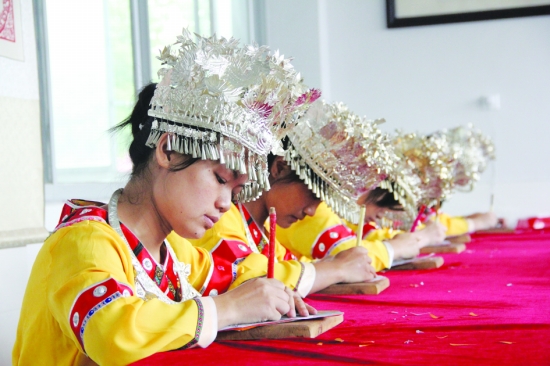 近年来,泸溪县狠抓非物质文化遗产保护与传承工作,大力推行非物质文化遗产进校园活动。目前,该县在县职中、白沙小学、明德小学等多所学校开办了非遗培训班,效果很好。图为近日,该县职业中学踏虎凿花班的学生们正在专心致志凿制作品。 向晓菊 摄