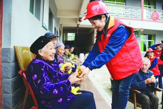 11月3日,永顺县电力公司组织共产党员服务队,带着大米、面条、食用油、水果等多种生活物资和慰问金,来到该县灵溪镇中心敬老院开展“献爱心,送温暖”活动,以实际行动播洒文明新风。图为电力员工在给老人递水果。 刘文化 余朝霞 摄