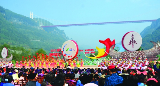 舞台上三面巨大的鼓与空中雄伟的矮寨特大悬索桥遥相呼应,既映衬出鼓舞之美,更展示出吉首之美。 本报记者 周玮玮 摄