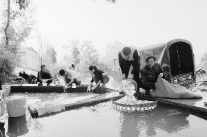 11月18日下午,永顺县吊井乡树木村4组村民正在水池里清洗刚采收的萝卜,准备第二天早晨用三轮车拉进县城批发上市。该村海拔1000多米,今年,修通了连接209国道的水泥路,又建成了蓄水池,群众的生产生活条件得到了较大改善。 吴华 何 亮 摄