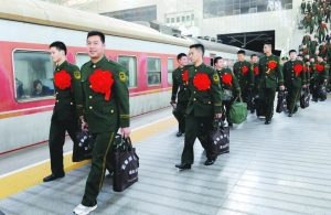 1月25日,武警河南省总队退伍战士在郑州火车站列队上车。当日,武警河南省总队2013退役战士欢送大会在郑州火车站举行,1000多名战士退伍返乡,告别军旅生活。