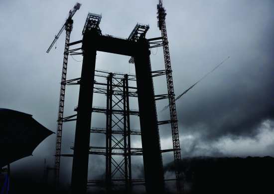 张花高速8标段从澧水大桥张家界岸向永顺岸用火箭抛送先导索现场,火箭拖着先导索到达永顺岸索塔旁瞬间。