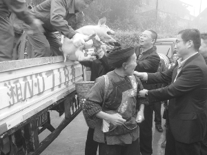 11月22日,湖南大康牧业集团来到花垣县排碧乡十八洞村6组,为该组28户村民每户送上一头“二元杂交”小母猪和一袋饲料,同时派出专业技术员现场为村民讲解“二元杂交”小母猪的养殖方法,深受村民的欢迎。 龙实夫 摄