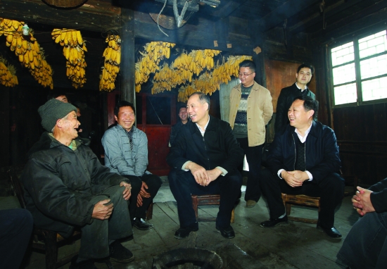 省委常委、省委组织部部长郭开朗(前排右二)在州委书记叶红专(前排右一)等州领导的陪同下看望金龙村81岁老党员龙兴亮(前排左一),并与这位56年党龄的老党员聊家常,话发展。 本报记者 彭 伟 摄