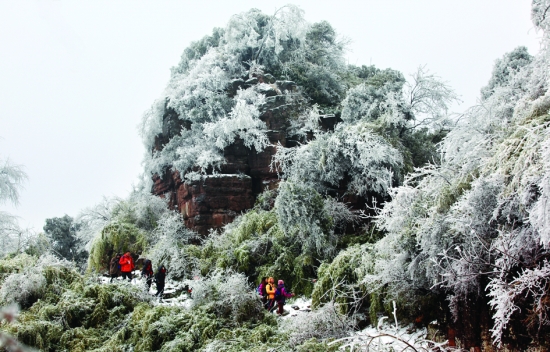 2月9日,泸溪县天桥山迎来了今年第一场雪,这里变成了玉树银花的世界,吸引了众多游客冒雪登山观赏。图为游客在天桥山踏雪观景。 李焱华 邓和生 李书鹏 摄