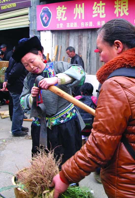 2月22日,一位苗族妇女正在乾州农贸市场选购锄头。目前雨水已过,为夺取今年农业丰收,不少农民群众趁赶集选购农具,积极做好今年备耕工作。 陈绪新 摄