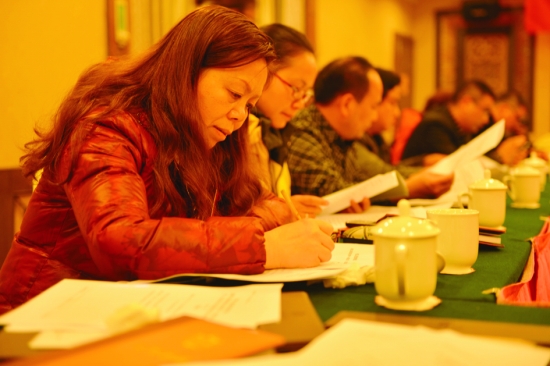 永顺县政协委员王湘兰正在撰写关于加强河流渔业管理的提案。