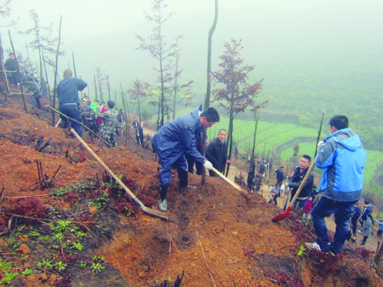 3月12日,泸溪县公路局干部职工及青年志愿者正在千山红水库植树。 向晓玲 杨世方 摄