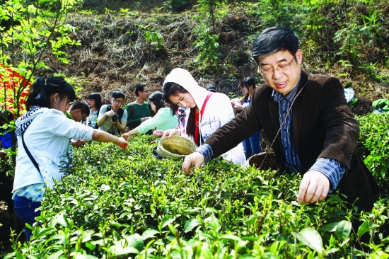 团结报社党员干部和茶农们一起采茶。 本报记者 彭 伟 摄