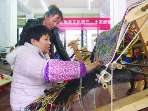 4月4日,在吉首市乾州古城土家织锦技能培训班上,从事该技艺23年的技师朱彩娥正在指导学员进行土家织锦的编织。据悉,此次参加培训的50名学员在经过培训后,所制作的产品将按照市场价格80元一副进行回收,以此在实现传承非物质遗产文化的同时增加贫困人员收益。今年以来,吉首市就业部门按照“精准扶贫”工作要求,以贫困群众“一户一职业”的目标,开办各种非遗培训班,不仅为参训学员提供良好的就业机会,而且对非物质文化遗产也起到了传承和发扬作用。