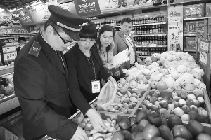 “五一”前夕,泸溪县开展农产品质量安全专项治理整顿活动,农业执法人员对全县的蔬菜种植基地、农贸市场、超市进行了经营档案、农药残毒、标签标示和产品质量的监督检测,确保人民群众吃上放心、安全的农产品。图为4 月30日,执法人员在白沙农贸市场和万家福超市对瓜果蔬菜等农产品进行抽样检查。 向民贵 张克宁 摄