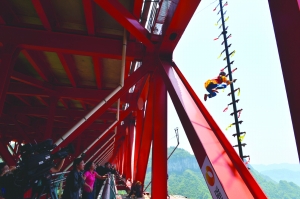 龙光青在矮寨大桥上用湘西传统技艺上演“刀尖上的舞蹈”,挑战成功,一战成名。 本报记者 田宏贵 摄 本报讯(记者 周名猛 田宏贵)5月1日,31岁的苗族巴代世家传承人龙光青三次爬上架有35把锋利钢刀、12米高的空中刀梯,完成双脚倒挂钢刀360度旋转、头顶倒立刀梯顶部、腹卧钢叉360度旋转等12项苗家绝技表演后,成功挑战挪威平衡大师埃斯基尔去年在此地表演的极限平衡术。 去年4月27日,挪威平衡大师埃斯基尔在矮寨大桥观光通道边缘,进行了徒手倒立、滚筒平衡、叠凳子等系列高空平衡挑战。一年之后,花垣县排料乡金龙村的“湘西奇人”龙光青决定在同一地点,以苗家刀梯绝技表演挑战埃斯基尔的高空平衡术表演。 当天天气晴朗,室外温度达30摄氏度,矮寨峡谷中山风横吹,大桥上车流如织,绑在大桥观光通道护栏上的一杯水始终荡漾着。伸出大桥一米之外,一架刀梯矗立在350米的高空中,钢刀把柄上的红黄绸子随风飘舞。身怀绝技的龙光青手握毛巾,不断地擦拭手心。 11时38分,在深呼吸一口气之后,龙光青在无任何安全措施的情况下,赤脚空拳爬上刀梯,开始了双手抓刀背靠刀梯360度旋转等表演。在观景平台上,龙光青的父母目不转睛地看着屏幕。父亲龙巴老抓着老伴的手,嘴里不时地念叨着“当心,慢点,稳当些。”十分钟的高空表演过去了,龙光青完成5项刀梯上的表演,下了刀梯进行调整休息。中午12时,龙光青再次爬上了刀梯。在表演双脚倒挂钢刀360度旋转时,龙光青往下一看,不禁喊了一声“好高啊!” 12时19分,龙光青准备第三次上刀梯。这次他不再是上一步踩一刀,而是双手握紧钢刀后,双脚快速跳跃上刀梯。这次刀梯上的表演是头顶倒立刀梯顶、腹卧钢叉360度旋转等“放开手脚”类项目。作为最后的表演项目,龙光青用了近8分钟来完成腹卧钢叉360度旋转的表演。12时38分,在结束了第三次空中刀梯表演后,龙光青下了刀梯,圆满完成了此次挑战表演。 |