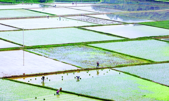 5月18日,花垣县龙潭镇大坪村农民在抓紧时间栽插水稻。今年该县规划种植优质水稻14万亩,分别在吉卫、龙潭、麻栗场、团结等乡镇建立4个万亩优质高产示范片,为今年粮食丰收打基础。 龙艾青 摄