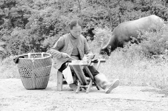 5月18日,花垣县麻栗场镇尖岩村,村民麻大姐一边放牛一边织花带。据麻大姐介绍,该村有近三分之一妇女喜欢织花带。这些农妇,在农闲时每天坚持织花带,然后把织好的花带拿出去卖。每条花带在当地卖100元左右。一般两天时间可以织成一条。农妇们在传承苗族传统手工艺的同时,还可以创收致富。 龙恩泽 摄