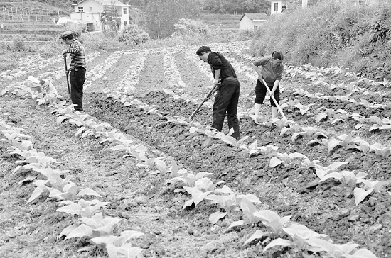 5月20日,永顺县松柏镇龙须村村民刘光斗一家正在给烤烟大培土。近几年来,刘光斗靠种烟致富,去年种烟15亩,收入68000余元。今年的烟苗长势更好,已全面进入大培土阶段。图为刘光斗一家在烤烟地忙着大培土。 罗远程 摄