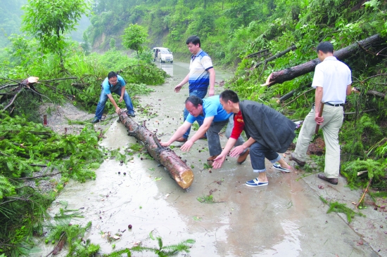 受持续强降雨影响,6月4日中午,花垣县民乐镇至两河乡公路多处塌方,乡道通行阻断。两河乡党委政府第一时间组织防汛应急队员奔赴现场及时排除险情疏通道路,经过两个小时的排险、抢险,通乡要道恢复畅通。图为党委政府干部正在抢险疏路。 黄 伟 摄