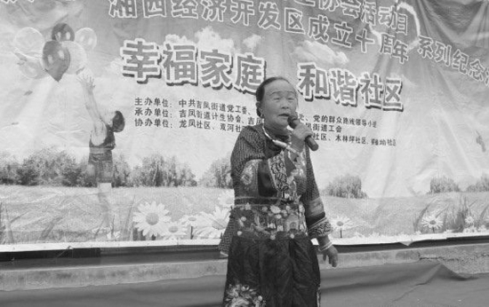 近日,吉凤街道办事处将党的群众路线教育实践活动与计生协会活动、社区文明创建活动及庆祝湘西经济开发区成立十周年活动相结合,组织该辖区的社区群众开展演讲比赛、趣味投篮、文艺表演、广场舞、有奖知识竞答等丰富多彩的文体活动,寓教于乐,寓教于思,吸引广大社区群众踊跃参与,为深入开展教育实践活动助力添彩。图为该社区大妈上台演唱苗歌。 本
