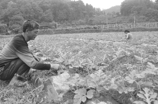 6月10日,永顺县松柏镇松柏居委会的村民向世银夫妇,正在西瓜地里拔草。向世银今年种植西瓜6亩,由于近来多雨天气影响,西瓜地里的杂草疯长,为了实现全面丰收,夫妻俩正赶着天气拔草护瓜。 罗远程 张 伟 摄