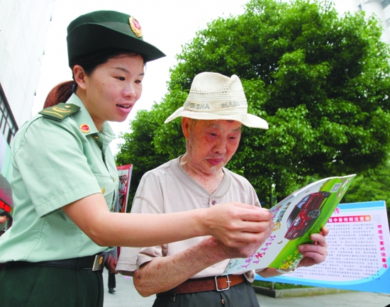 6月16日,泸溪县开展以“生命至上,安全第一,以人为本,安全发展”为主题的安全生产日宣传活动。武警消防、公安交警、技术监督局、农业局等35个职能部门通过发放资料、有奖猜题多种形式解答群众提出的问题。图为武警消防官兵在为群众讲解夏季安全防火知识。 向晓玲 张克宁 摄