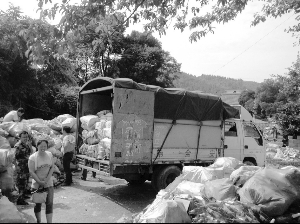 为做好垃圾分类减量处理工作,打造宜居环境,永顺县城乡同建同治办推陈出新,5月来采取以奖代补形式,开展酒瓶回收工作,截至发稿日,15个乡镇已成功回收交售25万个酒瓶。图为润雅乡政府人员在该县张家堡回收站交售酒瓶。