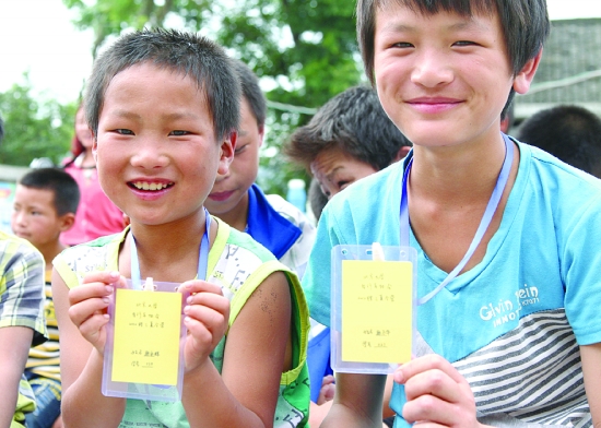 7月6日,花垣县吉卫镇腊乙村的留守儿童在展示刚刚领到的营员证。当天,来自北京大学自行车协会暑期远征实践团的14名同学,在该村开展留守儿童暑期夏令营活动,还帮助该村建设“爱心书屋”等。今年暑期,来自全国各地的大学生近300名,组成24支支教队伍,从7月5日开始,陆续来到该县乡村开展关爱留守儿童暑期社会实践活动。 龙恩泽 龙 权 摄