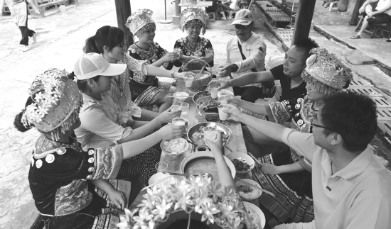 喝着清爽的苗家米酒,感受墨戎苗家的门板宴。 本报记者 田宏贵 摄