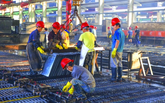 图为在电解车间,工人们在吊装、安放阳极板。