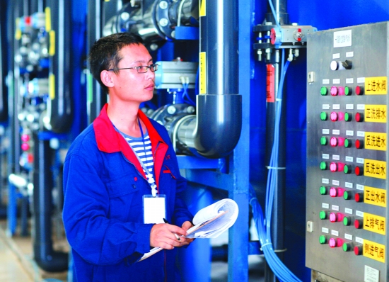 ▲图为员工在污水处理站观察、记录设备运行情况。