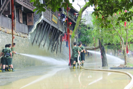 边城灾后重建工作有序开展 7月20日,花垣县边城镇边城景区内,该县消防官兵正在用高压水枪清理淤泥。目前,洪水已经消退,该县灾后重建工作正有序开展,数百名干部群众积极投入到安抚灾民、清理淤泥、排查安全隐患等灾后重建工作。 吴红艳 摄