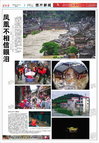 本报记者 张 谨 余 芳 特约记者 黄晓军 通讯员 施雨润苗 摄影报道 7月14日至15日,湘西凤凰遭遇特大暴雨袭击,雨情、水情、灾情历史罕见,百年不遇。从7月14日20时至15日24时,降雨量超过200毫米的乡镇有14个,其中降雨量最大为千工坪463.5毫米。据初步统计,全县受灾人口19.6万人,全县直接经济损失12亿元。转移群众和游客11.5万人,安置部分游客与居民到安全的宾馆免费住宿,由于水库调节科学,没有发生人员伤亡。 各单位投入到抗灾与恢复重建中,山江镇50名民兵进城救援,拾金3万元退游客,各种组织来到了凤凰进行爱心捐赠活动。17日,洪水全面退去,古城内开始清理垃圾,喷洒消毒剂。 4天的采访,这些人与事,让我们再次相信: 灾害是残酷的,人性是温暖的。 |