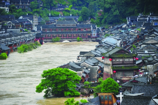 7月15日,凤凰古城洪水超过历史最高水位。北门码头全部淹没。