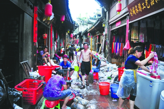 7月20日,凤凰古城中营街受灾商户正在清洗被淹商品。