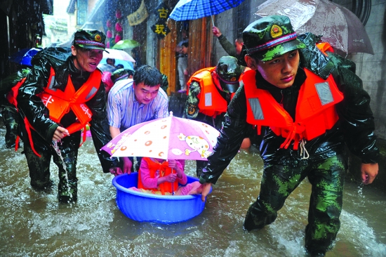 7月15日,武警战士首先把老人与小孩救援出来。