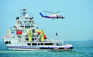 8月7日,在2014年海峡两岸海上联合搜救演练现场,东海救助第二飞行队在演练绳降。