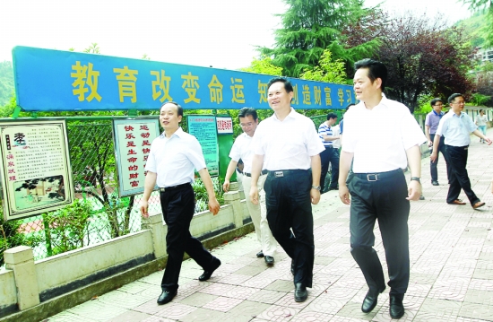 常德市委书记王群(右一),市委副书记、市长周德睿(左一)率领常德市党政代表团在州委书记叶红专(右二)等州领导的陪同下,考察了古丈县第一中学。本报记者 彭 伟 摄