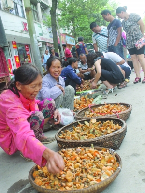 9月1日,保靖县清水坪镇的村民在集市上卖枞菌。 连日来,该镇村民纷纷上山采枞菌,一天采10至15公斤,可收入200至300元,野生枞菌成为山区农民另一创收途径。